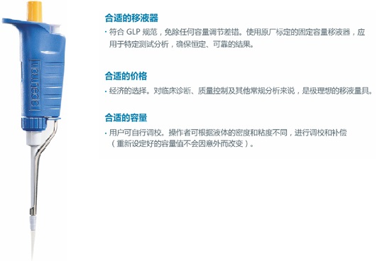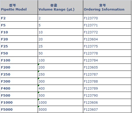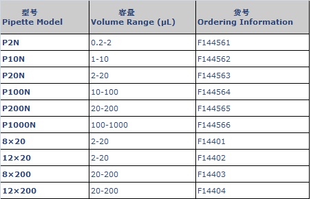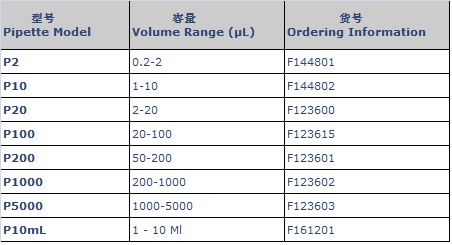 共有十二种型号,容量自0.2μL至10mL不等,有单通道,也有高通量的八通道及十二通道。
