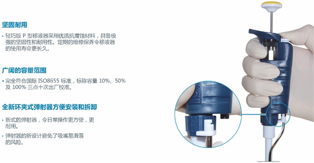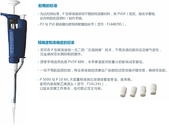 7.PIPETMAN P(P型移液器)是连续可调、数字直接显示(容量计)的空气排代式移液器。从设计到制作一丝不茍,以高精确度、耐用及重现性佳著称。