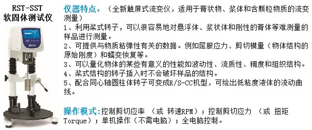 RST系列触屏流变仪同时具有控制剪切率(或 转速RPM)和剪切应力(或 扭矩Torque)两种模式,特别适用于复杂的流变学分析。RST流变仪拥有多步骤测试程序功能、测量系统自动识别功能、界面友好的图形显示LED触屏、用户自定义数据安全管理功能、转子快速连接功能、间隙自动调整功能。仪器表面易于清洁,设计持久耐用,可长期无故障运行。应用可选的Rheo3000软件进行自动测试,自动数据采集、保存和分析,可实现对物料从初始屈服应力到流动、松弛、蠕变和恢复的完整流变学行为评估。