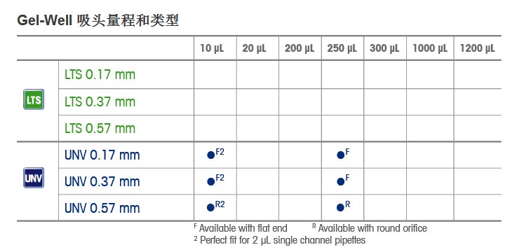 平孔或圆孔 Gel-Well吸头的孔端呈锥形,有时会变平形成非常窄的孔,非常适合所有加载凝胶的应用。 圆孔端的OD直径为0.57mm;平孔端较窄,外径大小为0.17mm或0.37mm。 多种规格、类型和包装选择 对于通用型移液器来说,Rainin Gel-Well吸头提供多种规格和类型。它们分为为消毒、消毒和带滤芯等三种规格。
