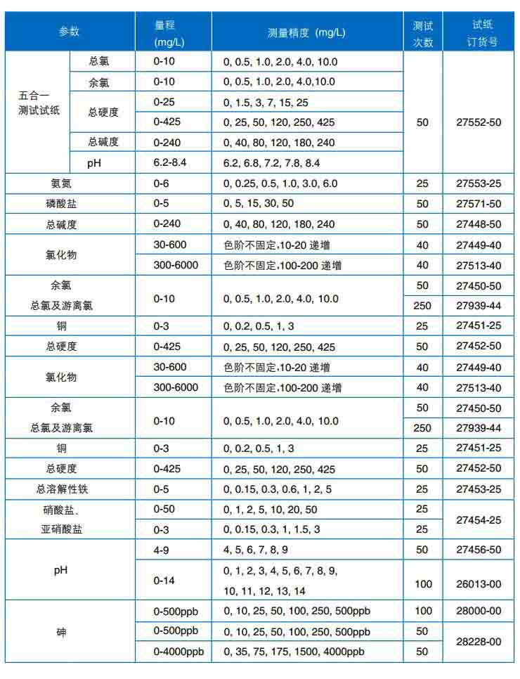 作为“预制试剂”理念的开创者,哈希公司一直致力于使水质分析过程更方便、更迅捷、更可靠。“预制试剂”是指各种包装的即开即用型化学试剂包或化学试剂套装,使用时无需进行繁琐的称量稀释等化学试剂配制工作,有别于常规分析试剂,比如分析纯的硫酸等原料试剂,还需要经过复杂的配制过程才能用于测试,因而预制试剂的使用节省了用户宝贵的时间和人力资源;由于严格的质量管理和先进的生产工艺,更为精确的化学分析提供了可靠的质量保障。预制试剂的使用已为广大中国用户提供了更加方便、周到、准确的测试体验,比如与哈希公司应急监测仪器的配套使用,更成为中国环境现场应急监测的首选。 哈希公司提供的水质测试试纸是一类非常简单、经济的水质测试产品,可对多个参数作定量分析。