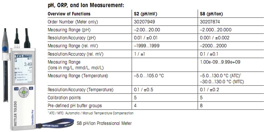 S2 pH计功能与参数 pH计:-2.00~20.00,精度:±0.01pH,mV:-1999~1999,温度:-5.0~105℃,自动/手动温度补偿,手动/自动定时终点,5点校正,4组内置缓冲液,1组用户自定义缓冲液,200组数据存储,IP67防尘防水 |