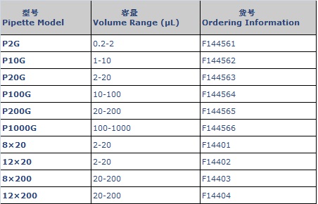 共有八种型号,量程覆盖范围自0.2μL至10mL。