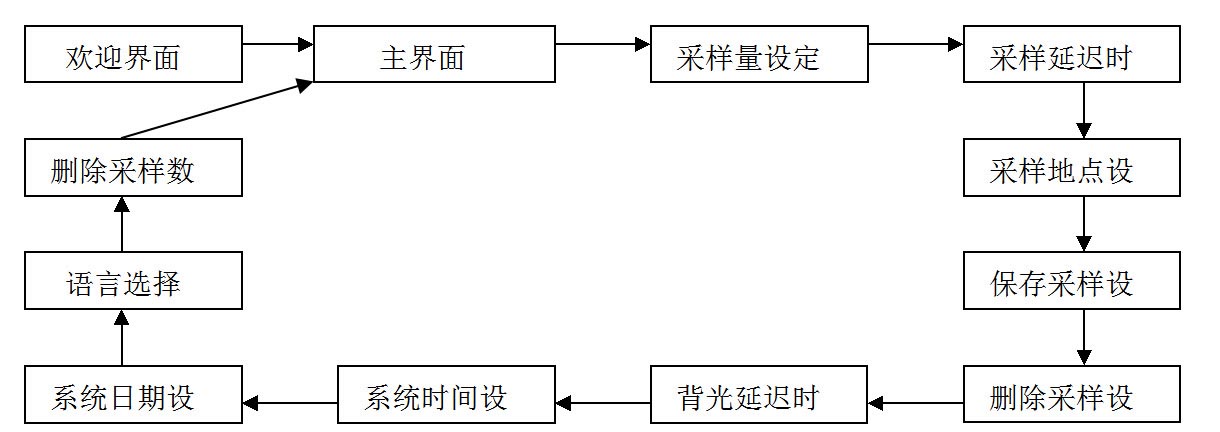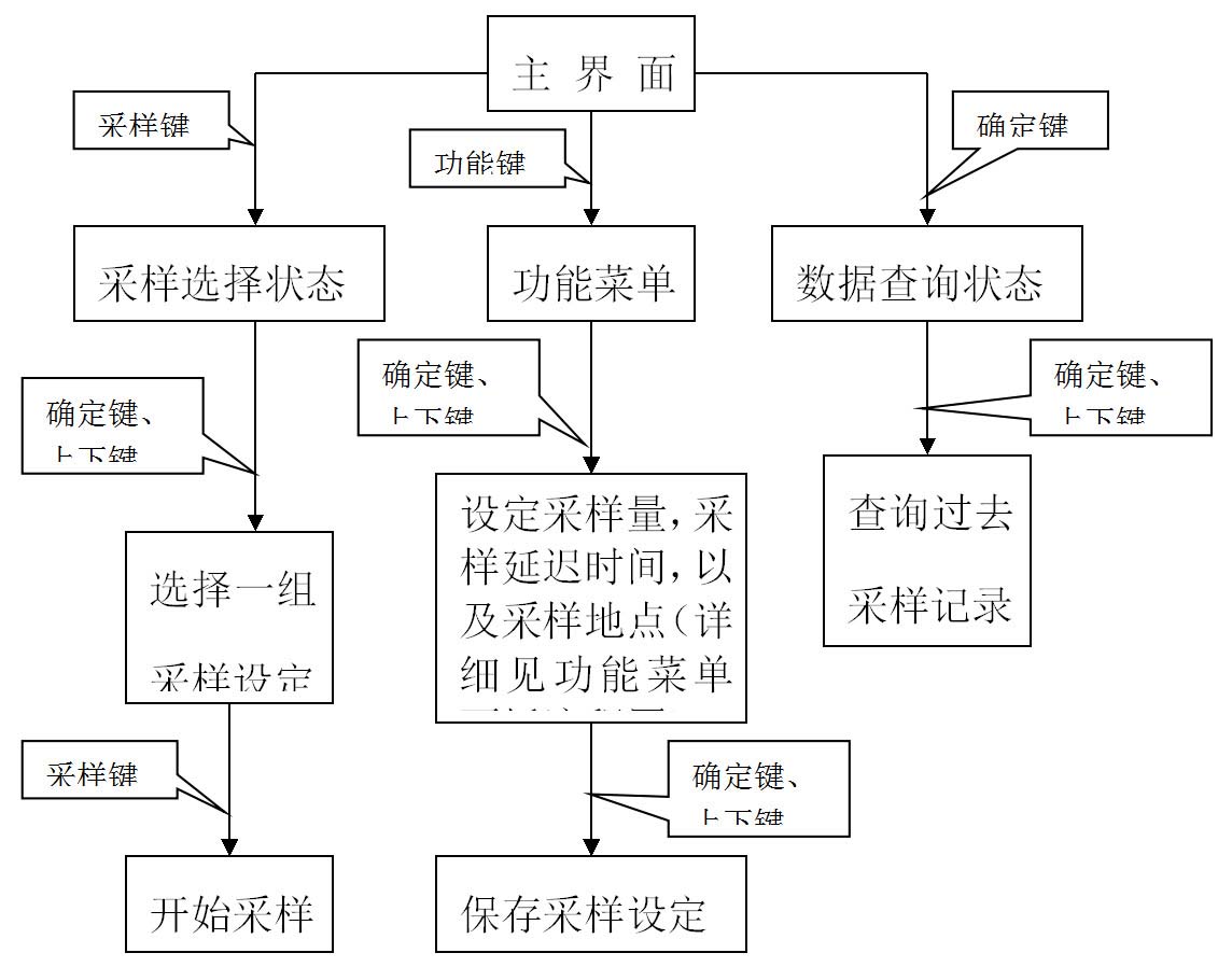 按下开关按钮,显示屏显示开机欢迎界面,设备将自动进行自检,自检完成进入主界面。此时按“功能”键进入参数设定状态: ⑴ 采样量设定:在此状态下按确定键调整光标位置,按上下键可调整采样量,其范围为10~6000升,调整步进为10升,按“停止”键退出参数设定,按“功能”键进入下一参数设定。 ⑵ 采样延迟时间设定:在此状态下按上下键可调整采样延迟时间,采样延迟时间范围为0~256秒,调整步进为1秒,按“停止”键退出参数设定,按“功能”键进入下一参数设定。 ⑶ 采样地点设定:在此状态下按上下键可调采样地点编码,编码范围为00~99,按“停止”键退出参数设定,按“功能”键进入下一参数设定。 ⑷ 保存采样设定: 按上下键选择是否保存当前的采样参数,并按确定键生效。 ⑸ 删除采样设定:按上下键选择是否删除已设定的采样参数,并按确定键生效。 ⑹ 背光延迟时间:在此状态下按上下键调节,背光延迟时间范围为0~256秒,调整步进为1秒。按确定键调整光标位置,按上下键可调整延迟时间,并按功能键或退出键生效; ⑺ 系统时间设定:按确定键调整光标位置,按上下键可调整系统时间,并按功能键或退出键生效; ⑻ 系统日期设定:按确定键调整光标位置,按上下键可调整系统日期,并按功能键或退出键生效; ⑼ 语言选择:按上下键选择系统语言,并按确定键生效。 ⑽ 删除采样数据:按上下键选择是否删除已保存的采样数据,并按确定键生效。 注意: 采样量,采样延迟时间,采样地点这三个参数在调整完以后,必须在第四项“保存采用设定”选项中选择“是”进行保存,设定方能生效,若选择“否”,相关设定将不保存;设定保存后,相关设定即生效,在主界面按采样键,可在参数选择状态下进行查看。